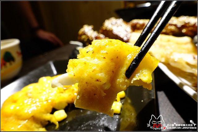 熱騰騰牽絲的濃郁起司,帶有豪邁的玉米與花枝來做客,覆蓋在甜不辣上頭