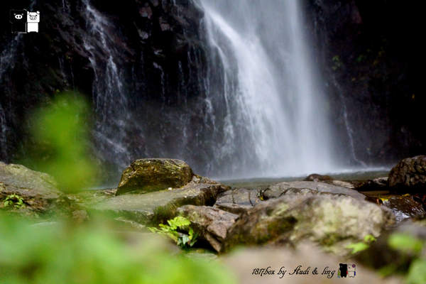 在瀑布下玩水,飄揚的水氣,清涼中別有一番風味,