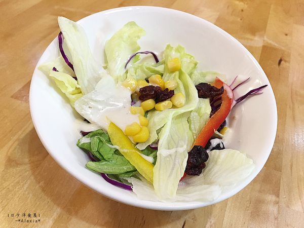 生菜沙拉有彩椒、生菜、紫高麗菜、玉米,竟然還有蔓越莓乾!