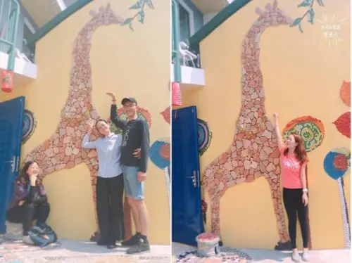大大的黃色牆面裡 有著一頭近2層樓高的長頸鹿