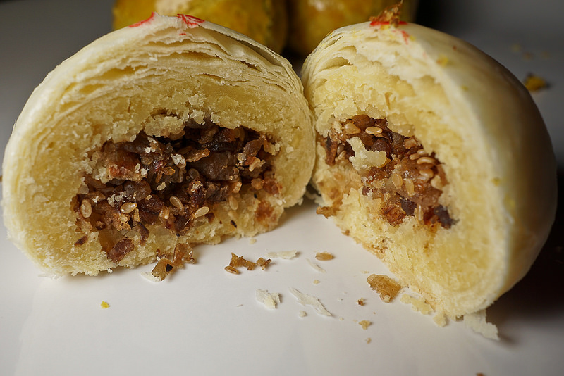 與常見的蛋黃酥使用豆沙或蓮蓉不一樣, 內餡與咖哩酥使用的一樣, 多一了一點肉燥的鹹香