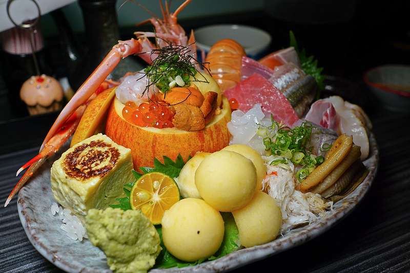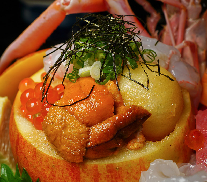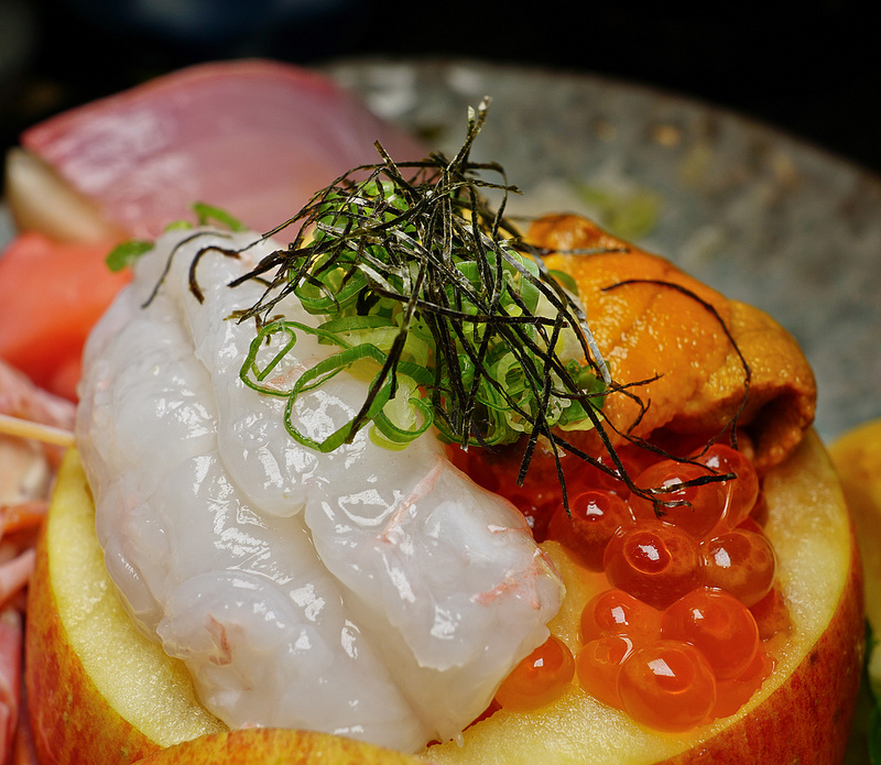 這是裡面果實( 用整個蘋果挖空雕成, 上面有海膽, 鮭魚卵