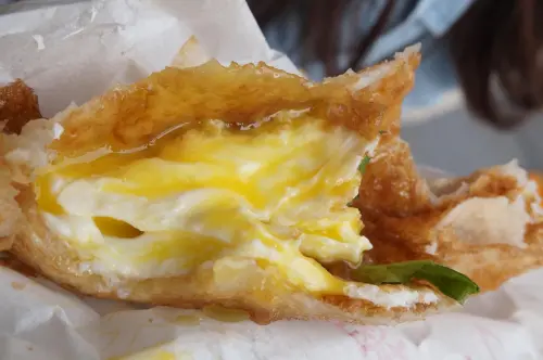 單層店餅皮內有著雞蛋、薯泥和起司的存在讓餅吃起來味道更香,