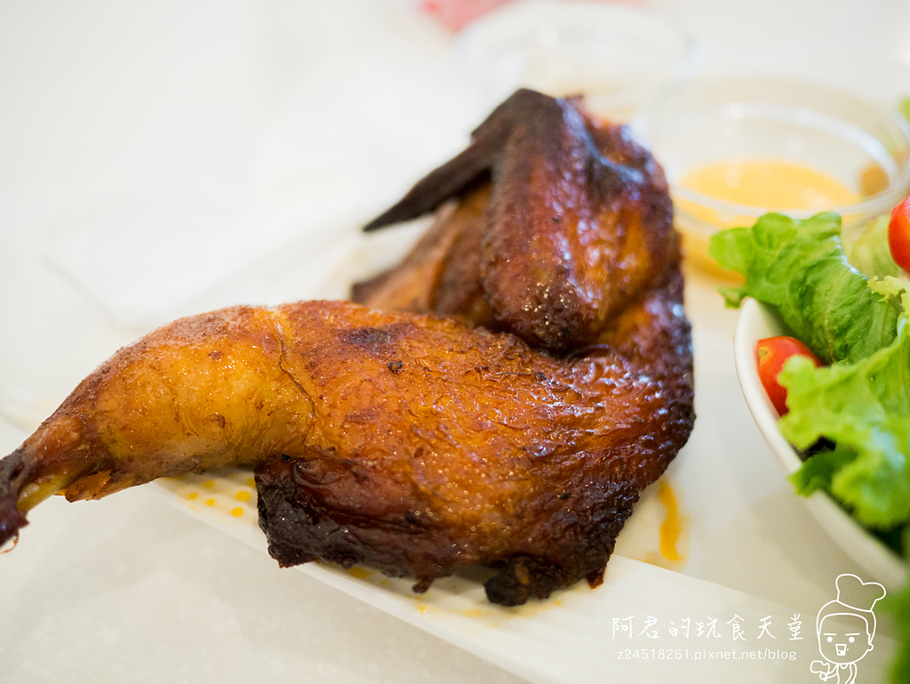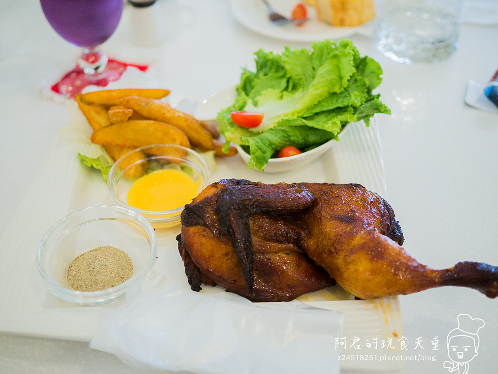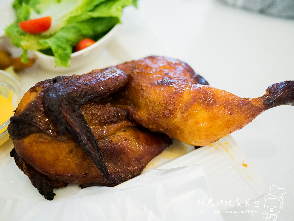 ▼香噴噴的迷迭碳烤奶油半雞上菜啦~~~,附有起司醬跟胡椒鹽,旁邊還有一雙塑膠手套可以使用,不過不要太快開動啊,這剛出爐的烤雞裡面可是超燙的。