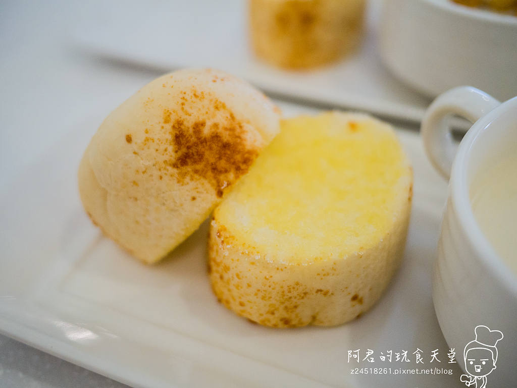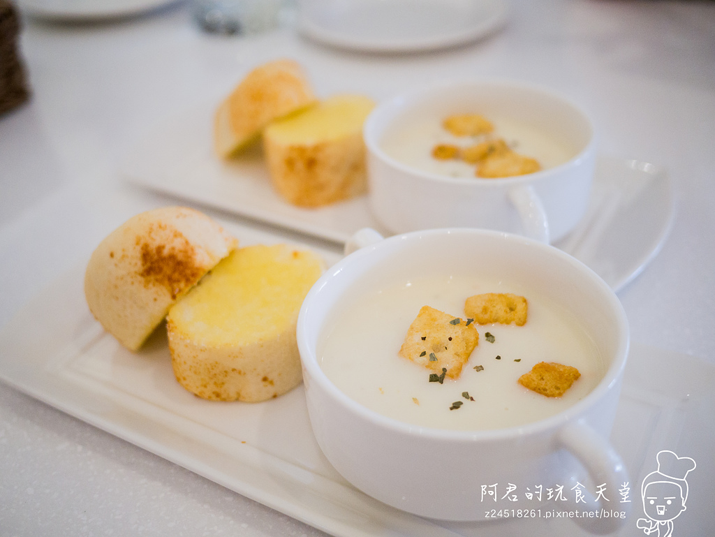 ▼這是套餐的主廚特調濃湯,及米蘭手工烘焙麵包,今天的是海鮮濃湯,有著非常的濃郁的奶香味,另外裡面除了有塊狀的馬鈴薯外,還有很多蛤蜊呢。