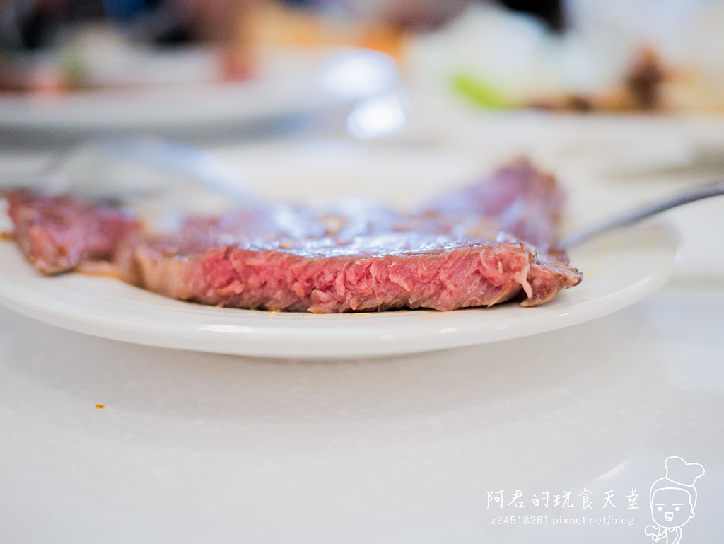 ▼8盎司嫩煎安格斯牛排,是含有肋眼的部位。另附甜菜跟德式香腸。