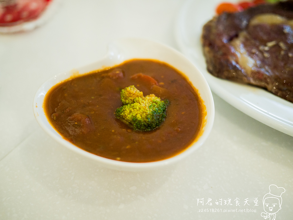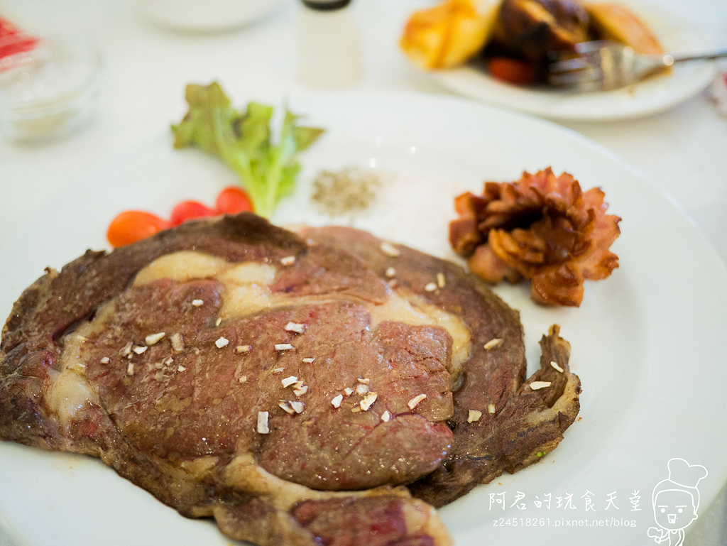 我們點的有8盎司嫩煎牛排尊爵牛排套餐,包含了湯、開胃菜(沙拉)、點心(麵包),甜點以及140元的飲料任選,$580,另一份則是迷迭碳烤奶油半雞套餐,一樣有湯,開胃沙拉變成韓式甜生菜加炸物,另外多了手工現做甜點。