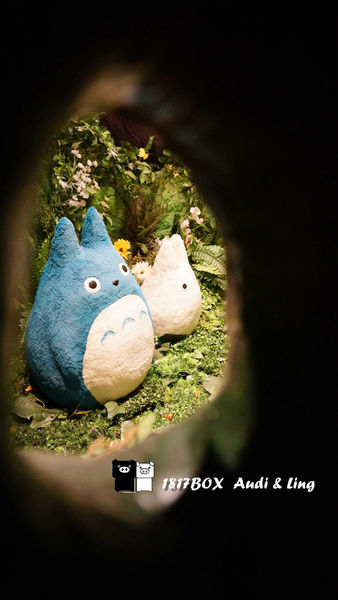 『龍貓』區:不僅可以跟等身大的龍貓、皋月及小梅一起等公車,更可以透過山壁上的每個小洞可以看到大小龍貓,大龍貓還睡得肚皮起伏