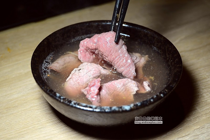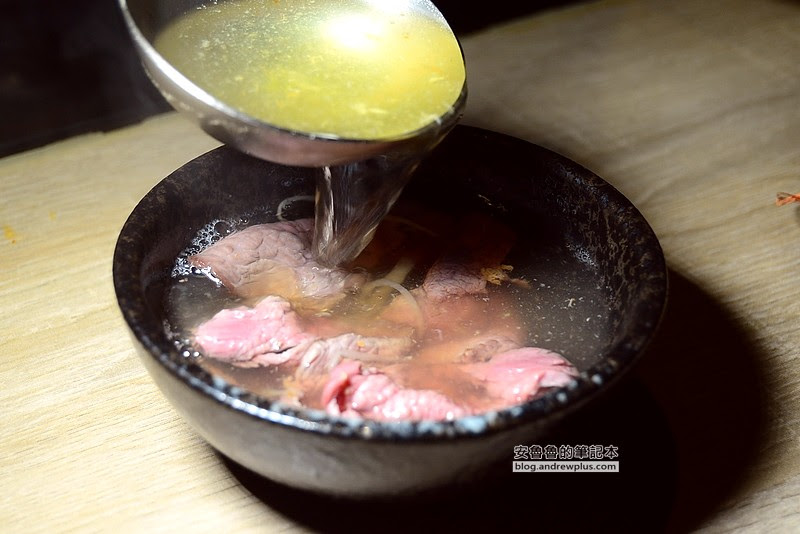 ▼再來試試看用沖燙的方式來燙牛肉,店家已經將薑絲放置於湯碗裡,進行沖燙時就讓人聯想到台南牛肉湯,只是這裡的肉片更厚實更大片一些!