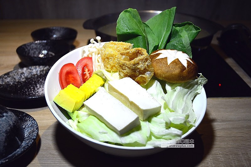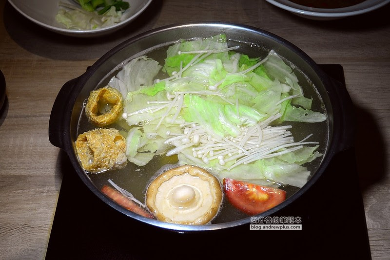 ▼菜盤裡除了豆皮,還真沒看到其他火鍋料,完全走健康養生路線,有番茄、南瓜、高麗菜、香菇、和豆腐等