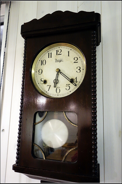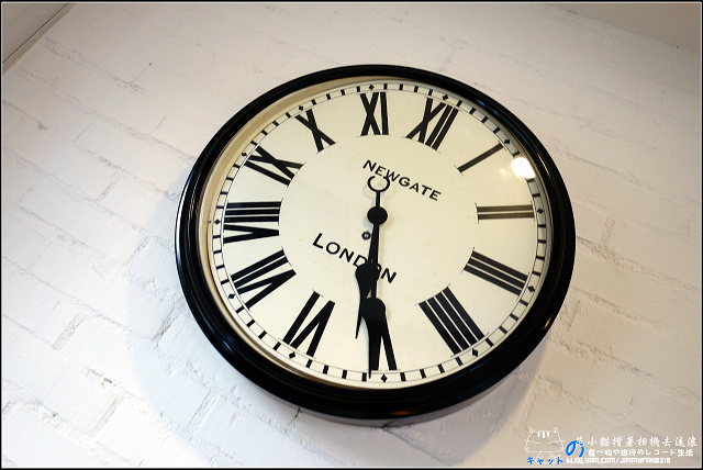 羅馬數字鐘掛在白色磚牆的文化石上,顯得很搭