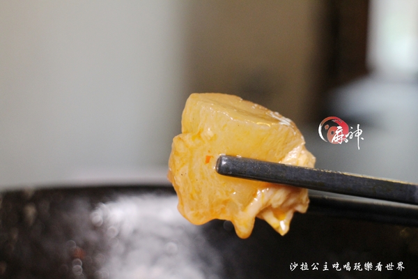 切片後再利用麻神的麻辣湯燉煮,吸收麻辣的精華及香氣