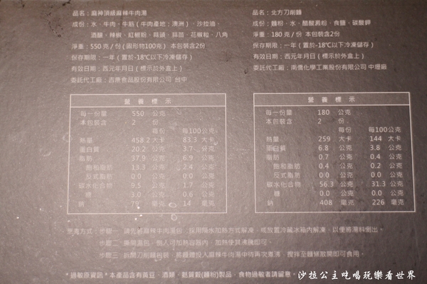 開運麻神牛肉麵的包裝上有清楚的營養標、成分及食用方式