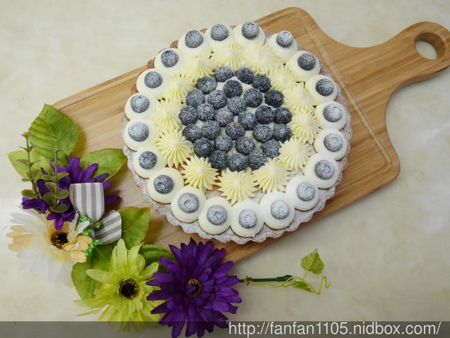 一打開就聞到杏仁的香氣,酥脆的塔皮太妃上面佈滿了新鮮的藍莓與焦糖乳酪