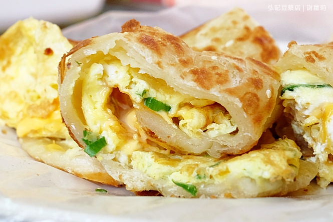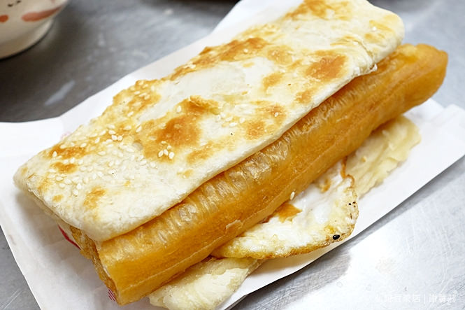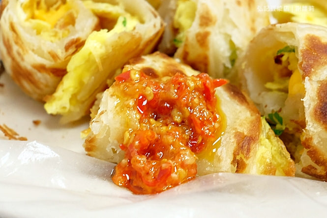 不同於外面蛋餅,它的特色在於麵衣擁有十足酥脆的口感,就像吃著厚片餅乾,咀嚼在嘴裡可是會卡滋作響呦!雖然一樣用油煎,卻絲毫不會讓人覺得油膩,捲著起司片,交織出一股鹹香滋味,外皮既富含嚼勁,又有綴點的白芝麻香味,不愧是店家招牌,著實極為出色。