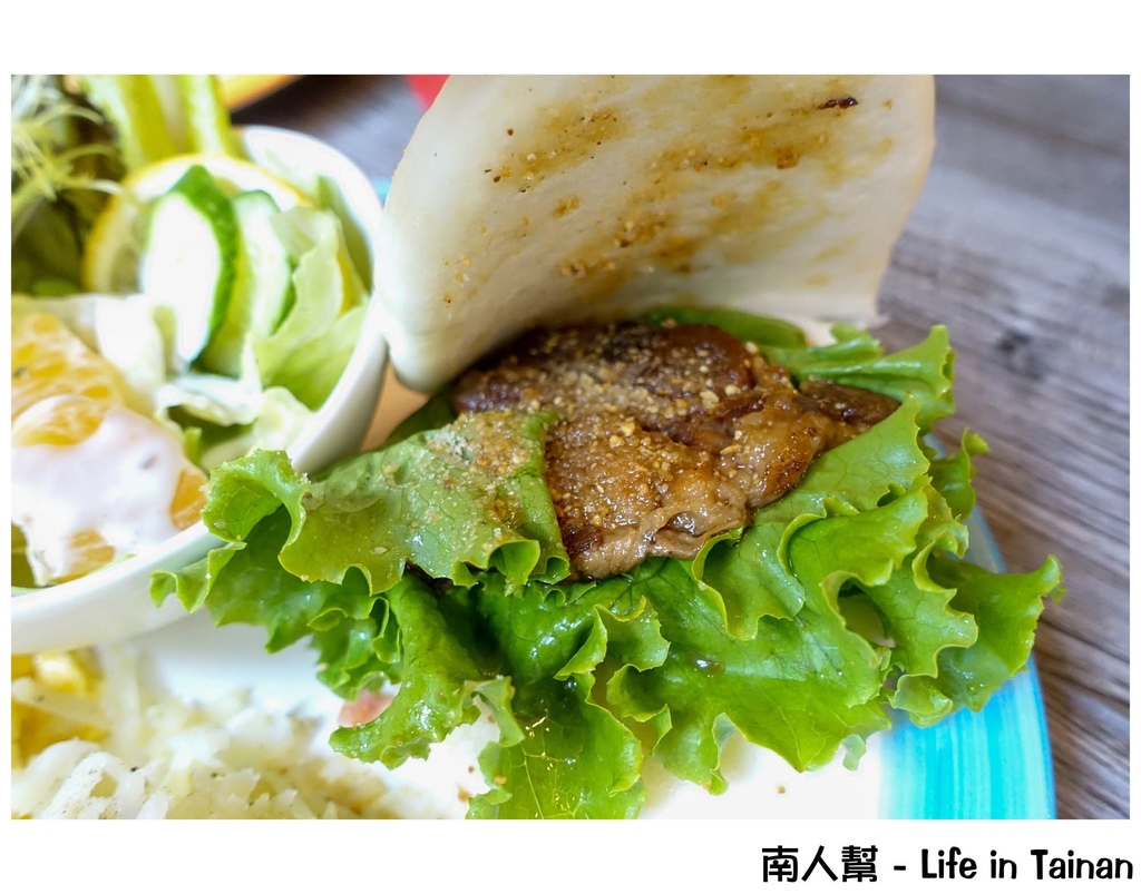 我居然在西式風格餐廳點台式的刈包,還真特別,爌肉是店家特製的,肥瘦適中,刈包皮QQ的,鹹甜鹹甜的,還帶著花生粉香,還不錯吃,旁邊一樣搭配優格沙拉和馬鈴薯。