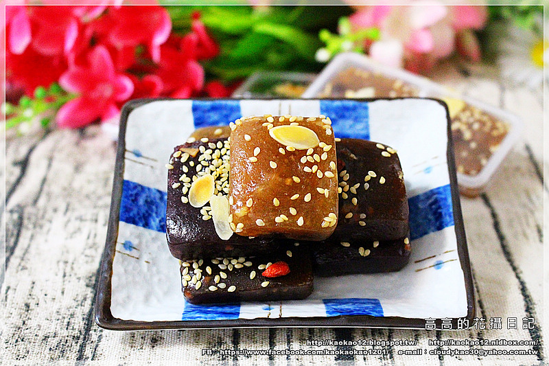 顏色最淡的是原味八寶年糕,顏色深一些、有加一些枸杞點綴的是黑糖薑汁八寶年糕,