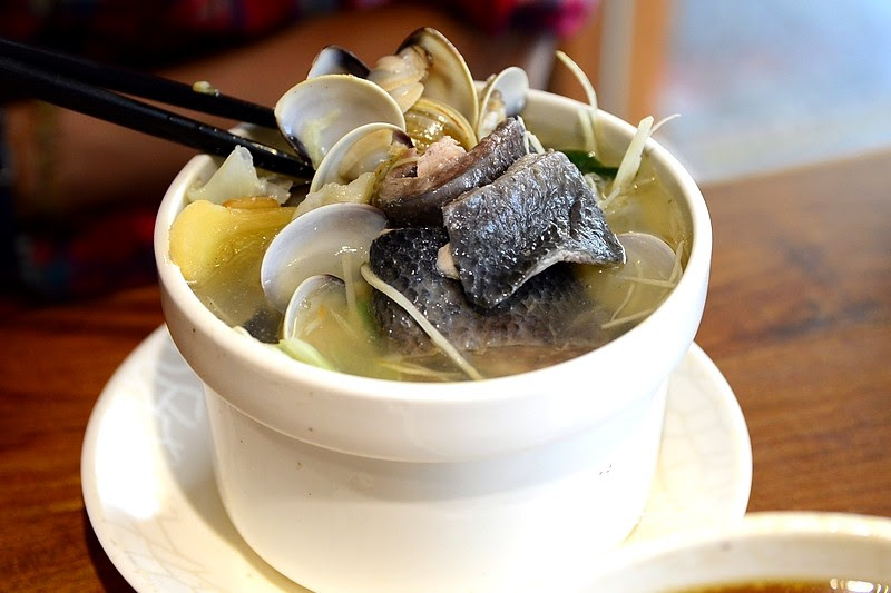 用料超豐富!不但有滿出來的蛤蜊、還有一片片可以直接入口的虱目魚皮,搭配著高麗菜熬出湯頭的鮮甜,再用薑絲去腥提味
