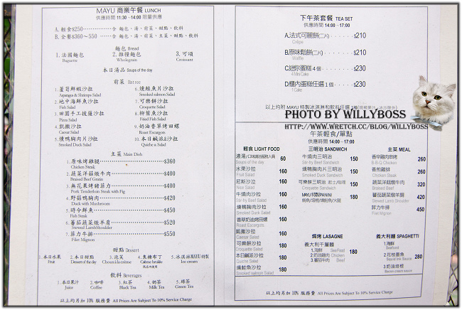菜單可以參考一下,用餐大約300~500元(要加一成),商業午餐假日也能點喔!只是有11:30~14:00的供應時間限制而已,加70元就可以變成任選蛋糕的套餐,是說午茶輕食類比想像中便宜不少。
