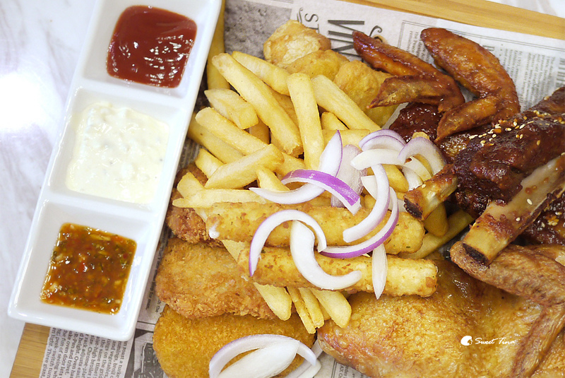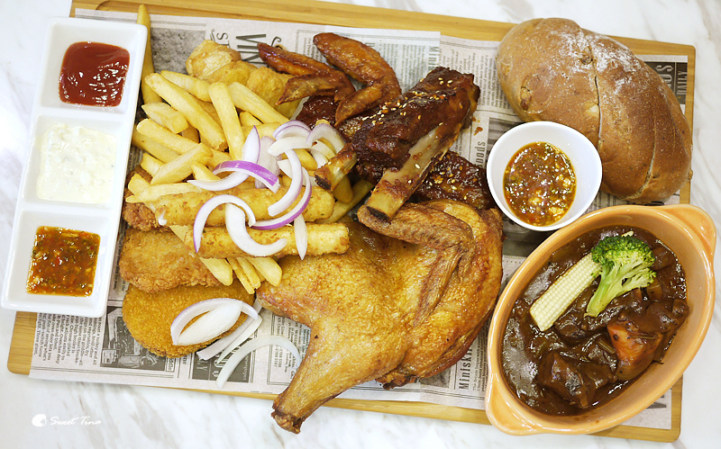 右邊是歐式麵包餐,中間為義式爐烤半雞佐泰式香檸醬 +醬燒碳烤豬肋排,左邊為歡樂炸物大拼盤。