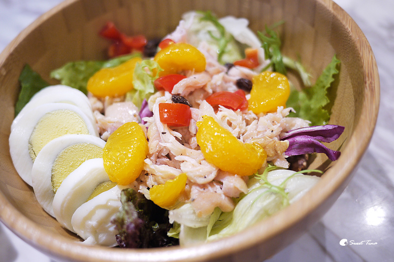 【主廚經典雞胸肉沙拉】(柳橙醬/凱薩醬,2選1),我們選擇的是柳橙醬。
