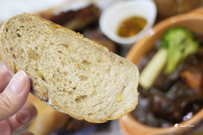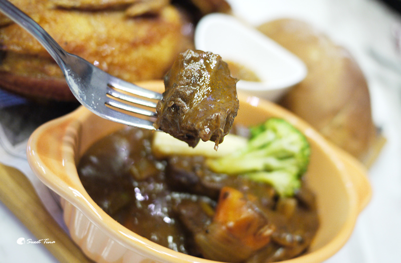 【歐式麵包餐】有多種沾醬可選擇,我們選擇的是法式紅酒燉牛肋條,可別以為只有簡單的沾醬,裡頭的牛肉還不少塊,而且每塊都燉的很軟嫰呢!