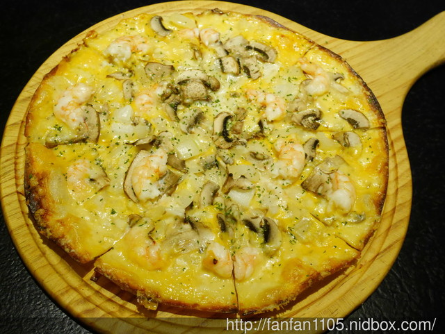 餅皮使用法式鄉村醬,再擺上蘑菇與洋蔥搭配鮮蝦塊,灑上厚厚的傑克,查特起司與帕馬森起司,