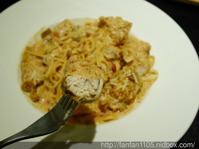 哈克廚房將酥炸雞柳,裏上奶油蕃茄醬再加上蘑菇,搭配義大利麵條,製成了一道創新口感的麵食