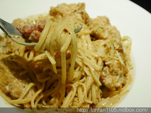粉紅醬是奶油白醬加番茄紅醬,使用獨家比例調製而成,湯汁偏橘色調,吃起來的味道是濃郁的奶香帶點微酸的滋味