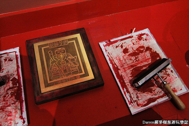 DIY土地公版畫製作區,小朋友用滾輪滾一滾就會出現土地公,拜拜的金銀紙也是運用類似方式