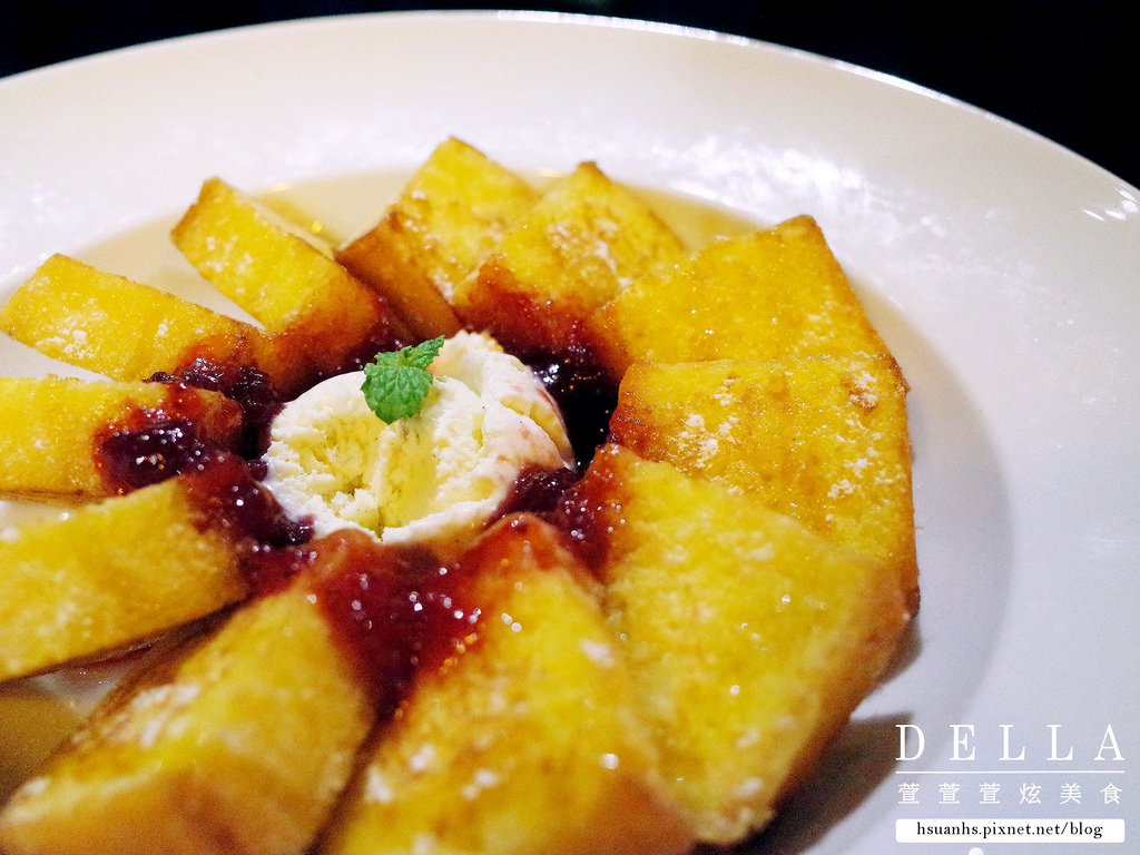 將磅蛋糕沾滿蛋液後香煎,出餐時撒上薄薄一層白糖粉,一旁搭配莫凡比香草冰淇淋和手工草莓醬