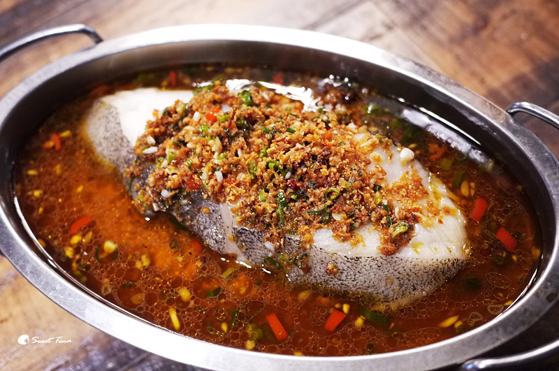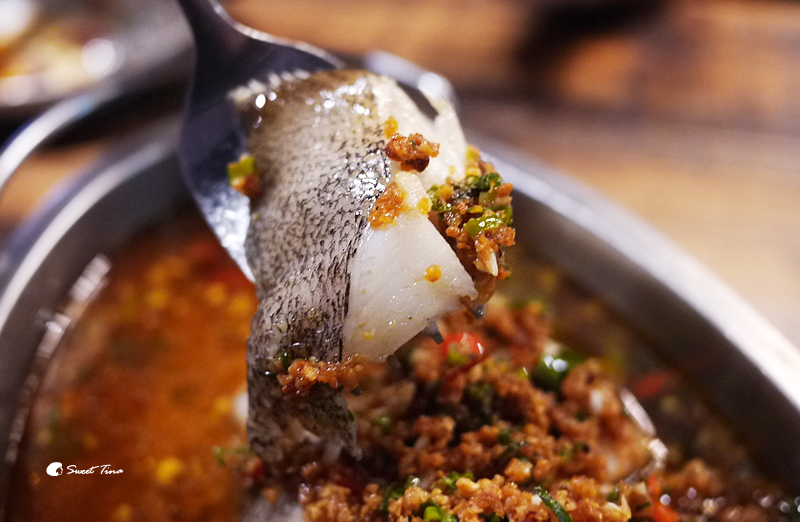 【豆酥扁鱈】小辣,這醬料調配的色香味具全呢,雖然底下的湯汁是較辣的,但上頭的豆酥辣度不高,沾一點點的湯汁及豆酥一同入口後,剛剛好的辣香味呢!