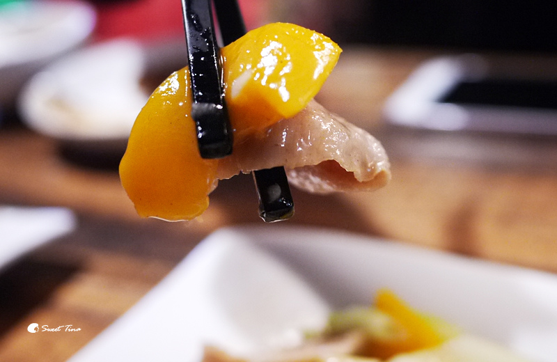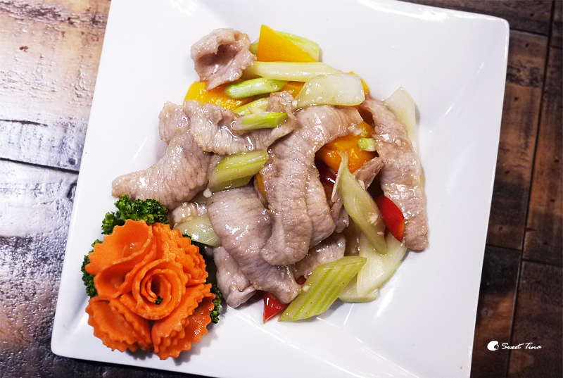 【蜜桃松阪豬】不辣,和水蜜桃一同拌抄後,帶點甜味的松板豬,口感還挺特別的,而豬肉的部份也處理的非常好入口哦!