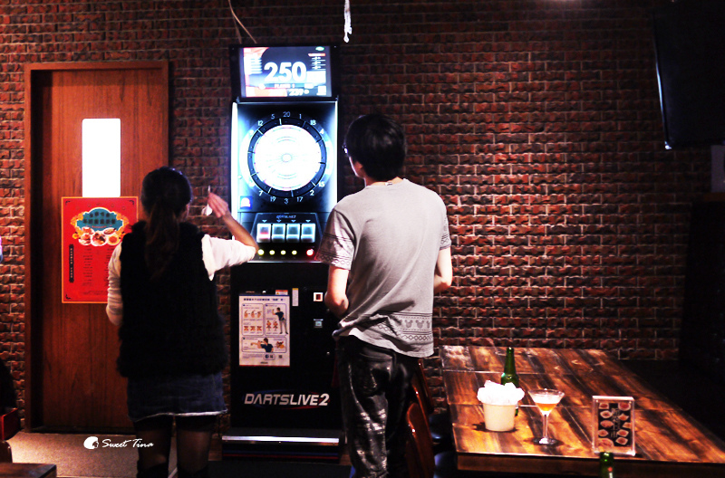 一旁靠牆的地方,有提供大螢幕讓大家觀看,但拉上去後,底下就是一台飛鏢機了,較晚時有幾位來這喝酒的客人,就在這邊喝酒聊天邊玩飛鏢!