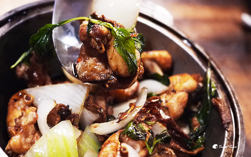 【三杯田雞】不辣,經由九層塔、蒜頭、薑、洋蔥一同調配後的田雞,香氣十足,田雞的口感非常紮實有咬勁呢!
