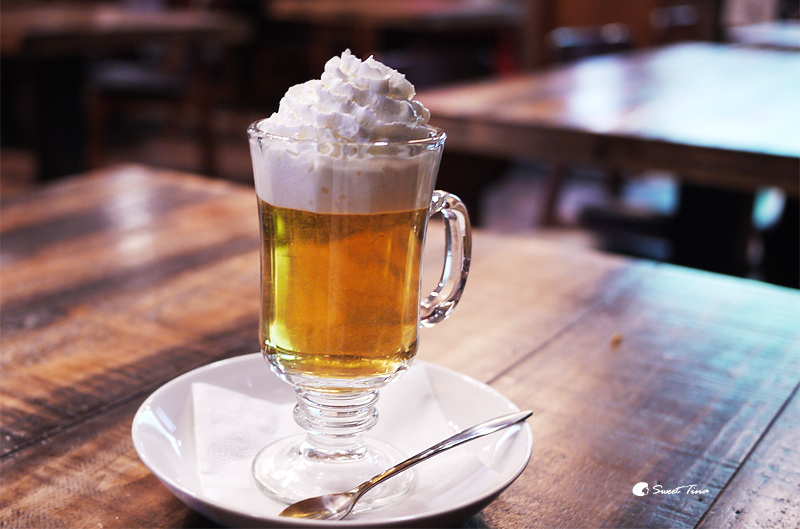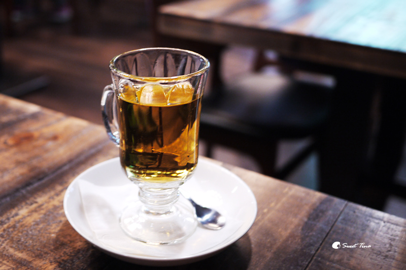 【蜜桃蘋果派】是溫熱的調酒,喝起來是屬甜度較明顯的酒哦,而且調配後是沒有酒精味的口感呢,很適合女孩兒喝的酒。