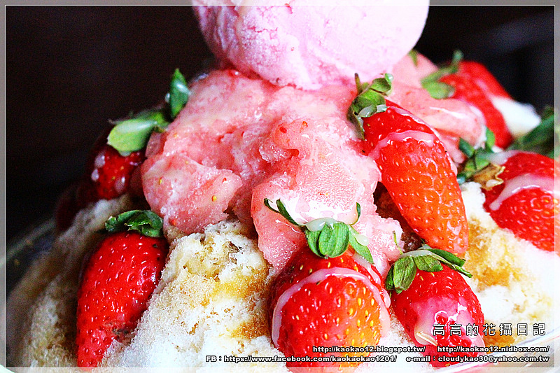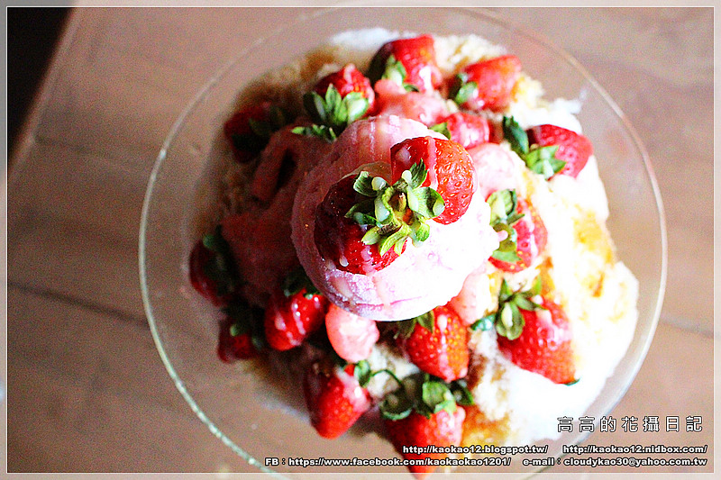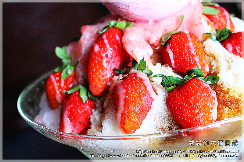口感很細緻的刨冰、濃郁甜蜜的黑糖蜜、新鮮草莓切半、煉乳、