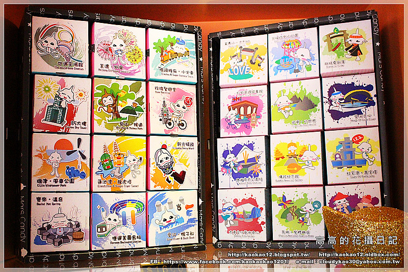 這邊是火星糖的寶島禮盒系列,一共有18款不同的臺灣各地景點設計圖片外盒,