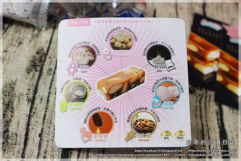 使用了夏威夷豆、杏仁果、鮮奶、海藻糖、麥芽糖、寒天、海鹽,這就是製作火星糖的七大夥伴啦。