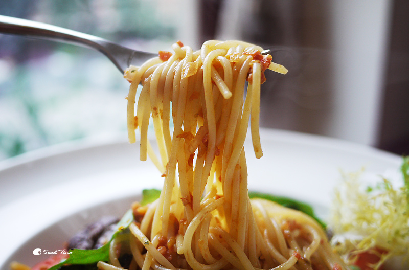 麵條吸飽了湯汁,非常Q彈,而醬料上雖然是茄汁口味,但是溫和帶點甜味的茄汁,非常順口,和以往品嚐過較明顯的酸味不太一樣,連瑋兒也好喜歡呢!