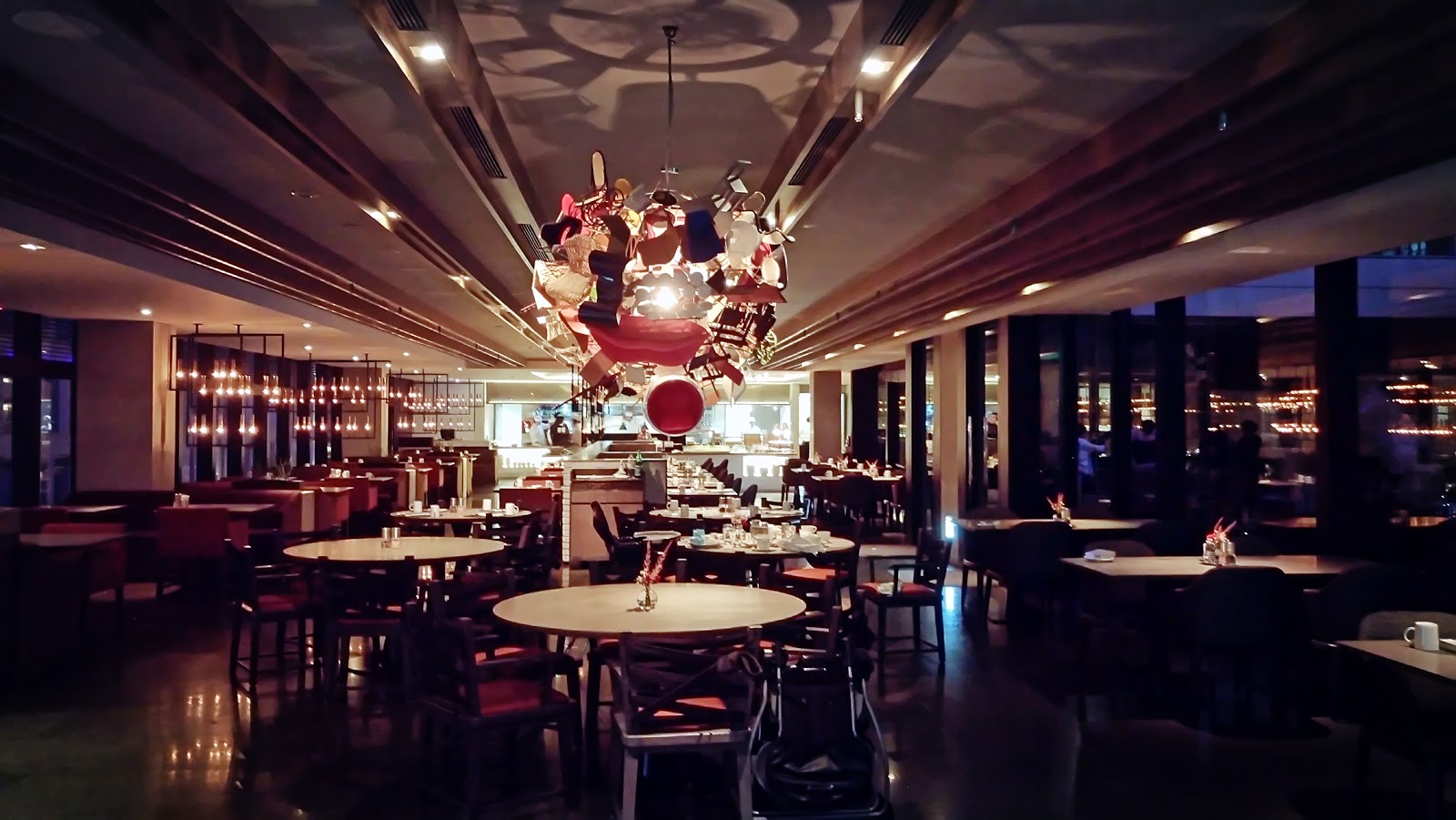 前面是圓桌,後方則是沙發區,上懸一整排蠟燭式吊燈,為昏暗的餐廳整體帶來不少優雅氣氛。