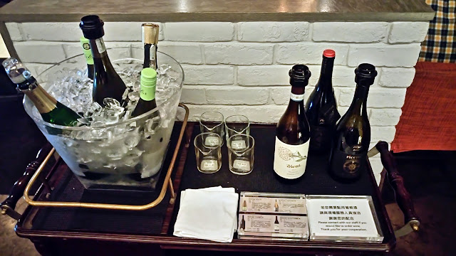 旁邊有四種葡萄酒,兩種白酒與紅酒。