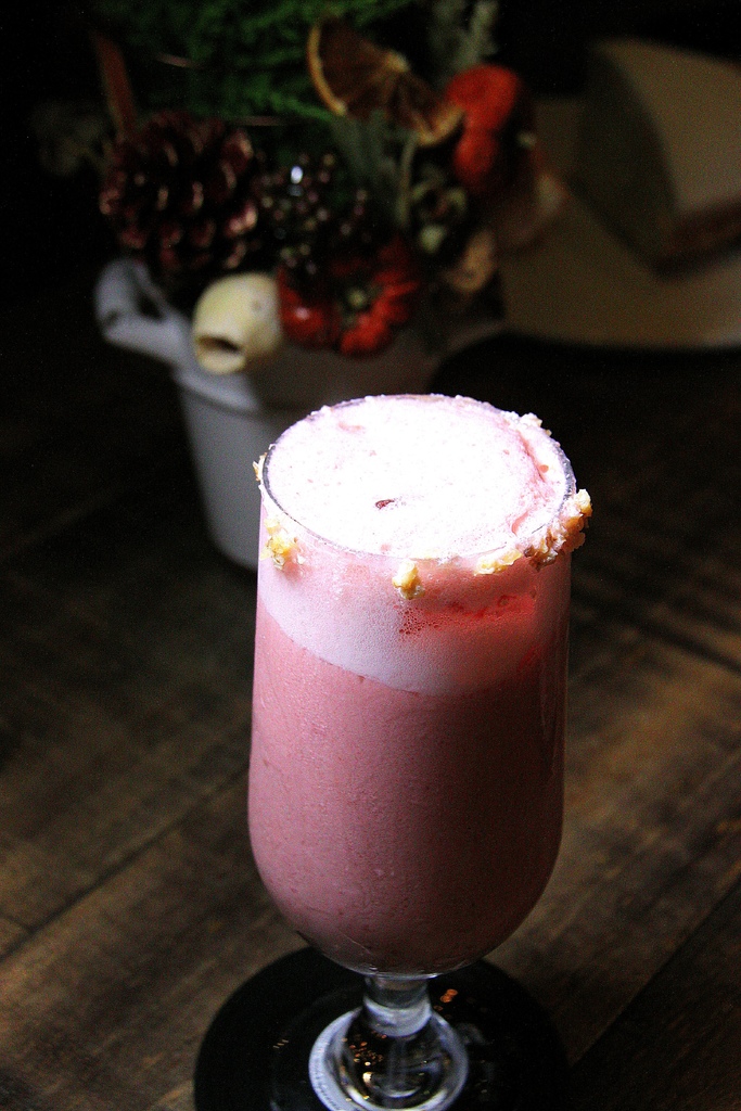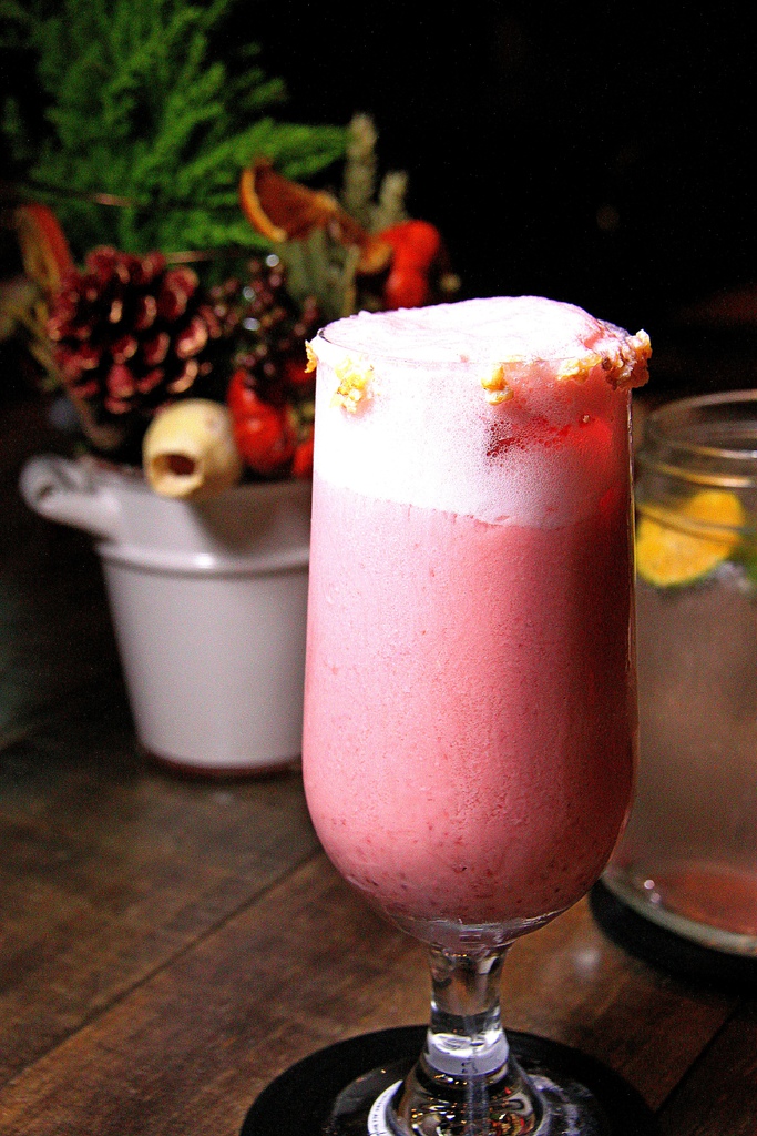 帶有漂亮的粉紅的色調和香檳的氣泡感,杯緣抹鹽巴一起喝下去提味