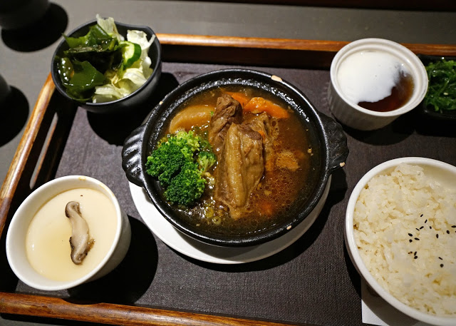這份紅酒牛肉定食除了茶碗蒸、小菜、甜點,還多了一份和風沙拉,新鮮的生菜與滑嫩的海帶,拌著和風醬汁,很開胃!