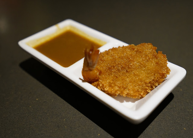 點餐後不久,黃金蝴蝶蝦就率先上桌了,這是九周年的特別活動,點餐滿390元可加價39元點一份,一份有兩隻蝦,蝴蝶蝦炸得金黃酥脆,沾著旁邊的咖哩醬汁入口,滋味更加豐富!