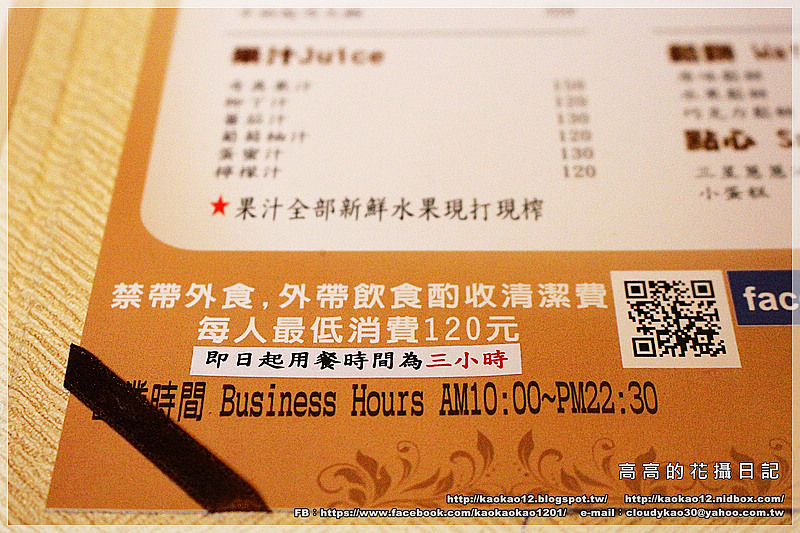 有每人低消120元,用餐時間限制三小時,
