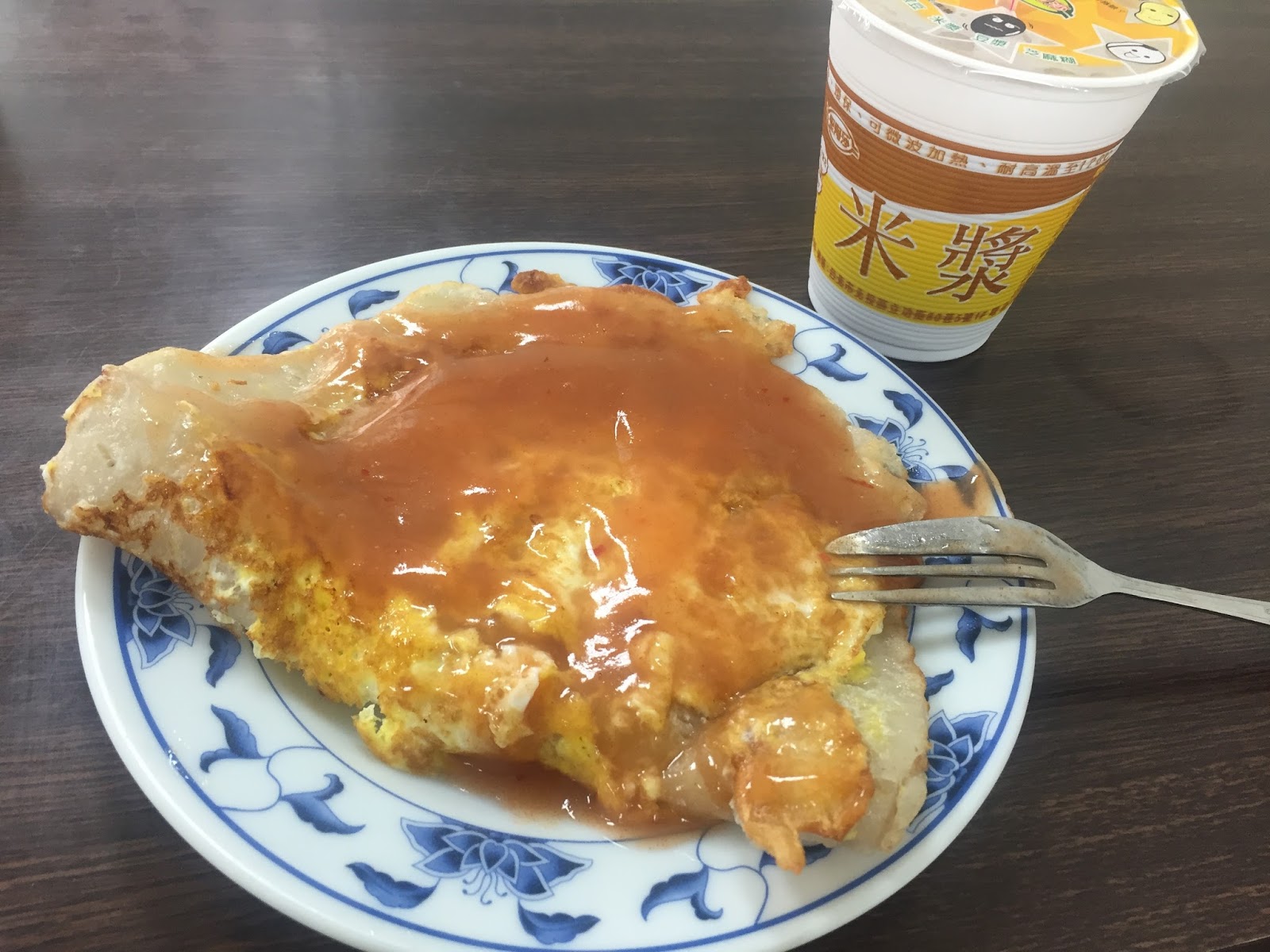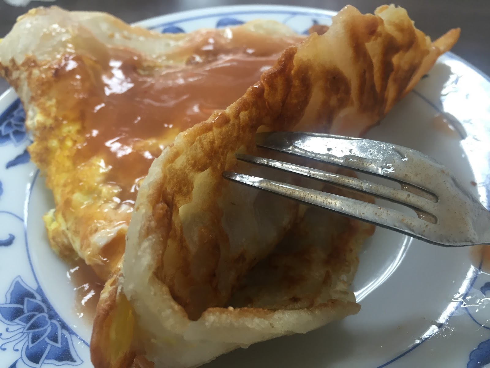 這種搭配實在是可以從下午飽到晚上9點,厚實的粉漿蛋餅加上蛋液的包覆,那不規則的外表正是手工現煎的證明,淋上那微辣的紅醬,開胃到一種不可思議!