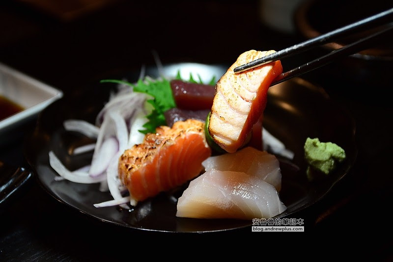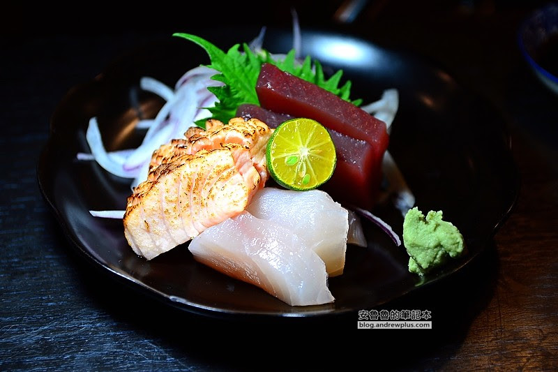 包含炙燒鮭魚、鮪魚、旗魚三種魚類,每片切成適合一口吃下的大小和厚度