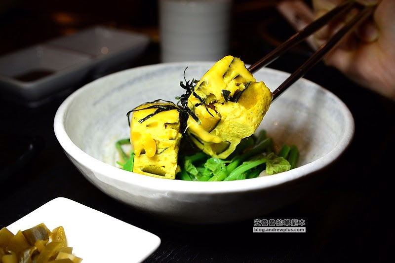 玉子燒裡有帶皮的栗子南瓜,上層有起司和海苔絲,吃起來口感扎實帶著微微的甜味,底層舖著清脆的龍鬚菜和杏鮑菇!玉子燒融合了栗子南瓜的製作手法還挺特別的~