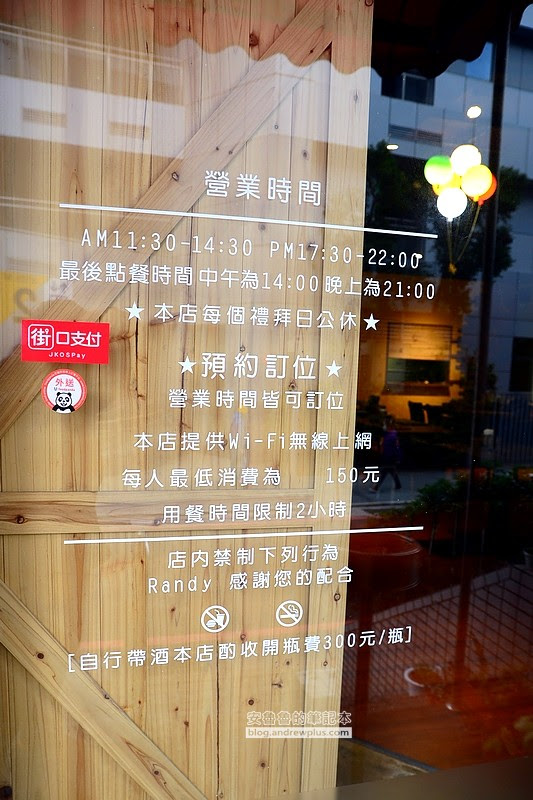 ▼玻璃門上有清楚的店家資訊,周日公休、有提供WIFI、低消150元等